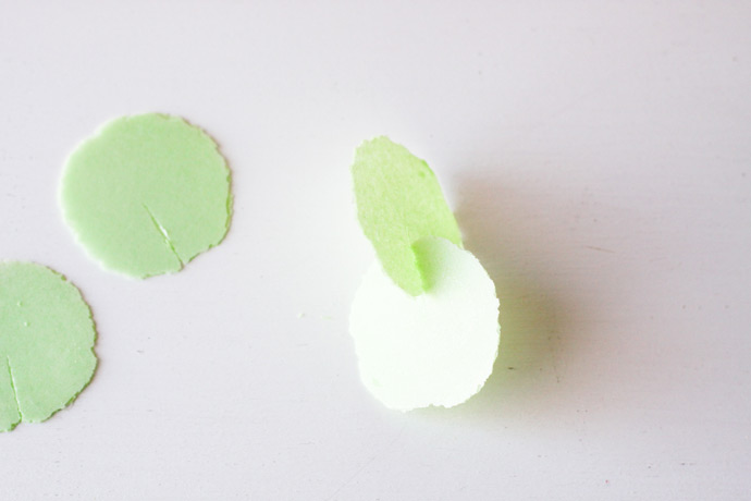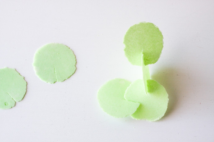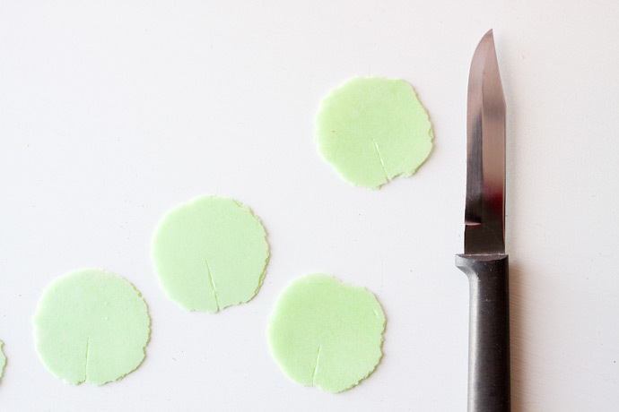 Using a knife, cut a slit in each green wheat cracker, not quite to the center.