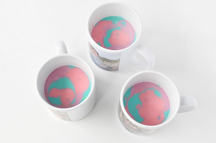 Spoon the batter into the mugs, alternating between the colors for a fun unicorn pattern.