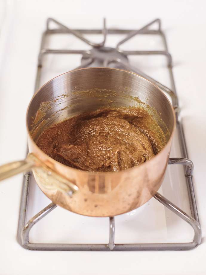Combine the pumpkin puree, sugar, butter, ginger, and cinnamon in a small saucepan and heat over low heat, stirring continuously until the butter has melted and the sugar has dissolved. Turn up the heat to medium and continue to heat the mixture, stirring constantly, until the mixture comes to a boil (the mixture is quite thick, so you need to look for slow bubbles). Once the puree is bubbling, turn the heat down to medium-low and cook the mixture for about 5 minutes, still stirring. Remove the puree from the heat. Cool to room temperature.
