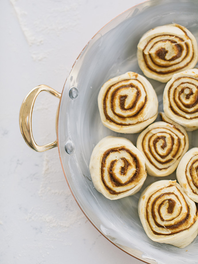Roll the dough up, starting at the short end. Using a sharp kitchen knife or a scissors, cut the log into 12 equal pieces.