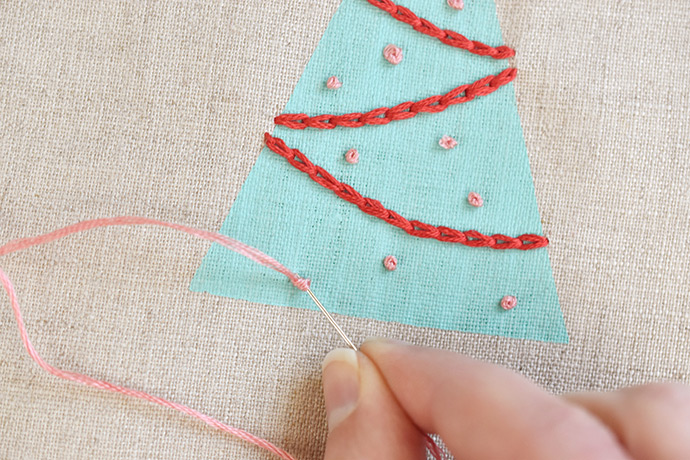 Decorate the tree with embroidery. Use all six strands and any kind of stitches you like. Be careful not to poke the needle all the way through the paint until it’s in the spot you want it. Otherwise it will leave a small hole.