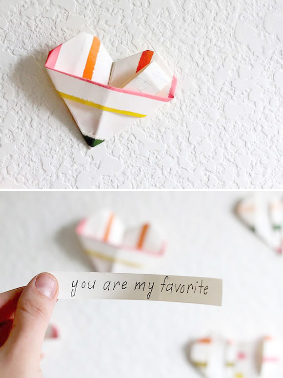 It’s the sweet retro colors of the paper that make these folded hearts extra cute. Who wouldn’t love to come home to a wall of love and heartfelt hidden messages?