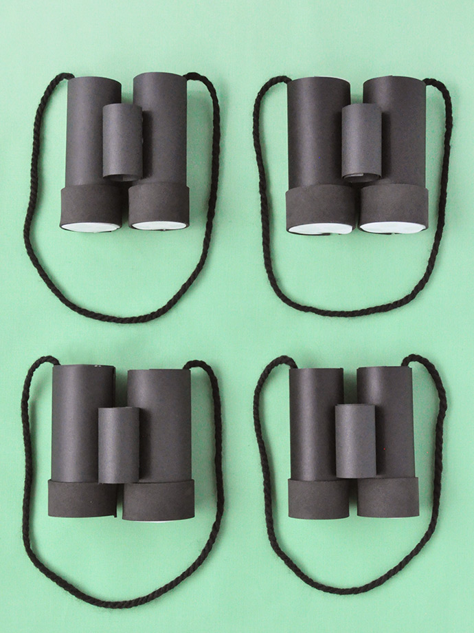 Cut black cardstock to fit the cardboard tubes. Use double-sided tape to secure and wrap around the tubes to cover. You need two tubes (toilet paper roll sized) for the main two parts of the binoculars. After you’ve covered the outside, cover the inside as well.