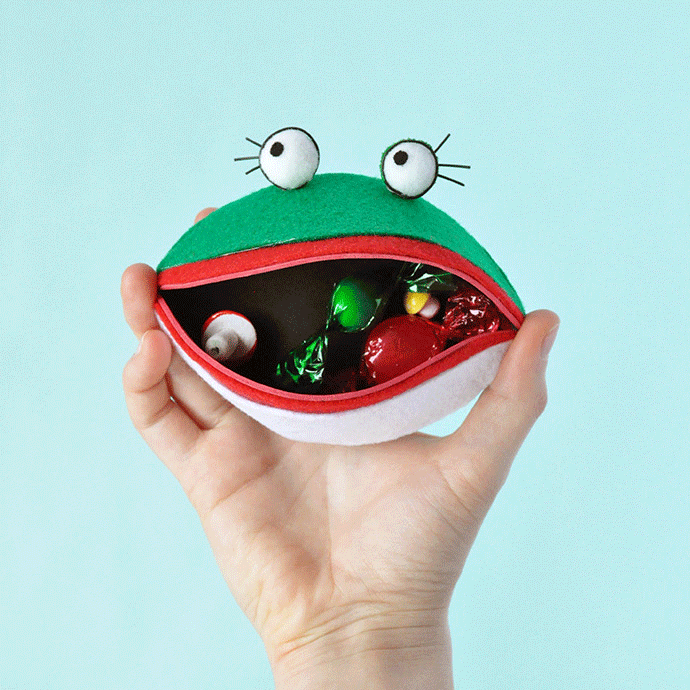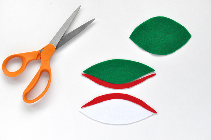 Trace the “back” template onto green felt, as well as the “front” felt piece. Then trace the “front felt” piece again, but on white felt this time. Finally trace the “lip” template twice onto red felt. Cut all the pieces out.