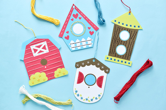 Print the birdhouses on card stock. Thicker card stock keeps the stitching cards sturdy while you stitch. Cut out the birdhouse shapes.