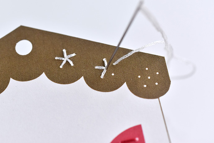 Start stitching through the pre-punched holes. It helps to flip the card over when you bring the needle through from back to front.