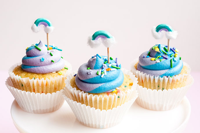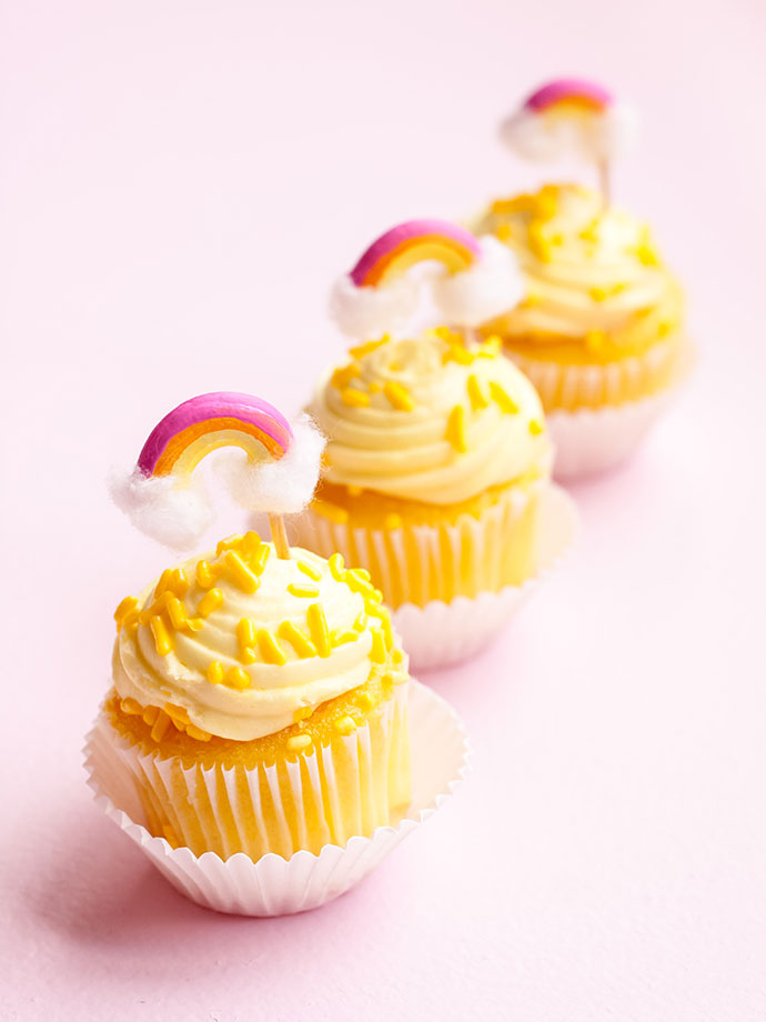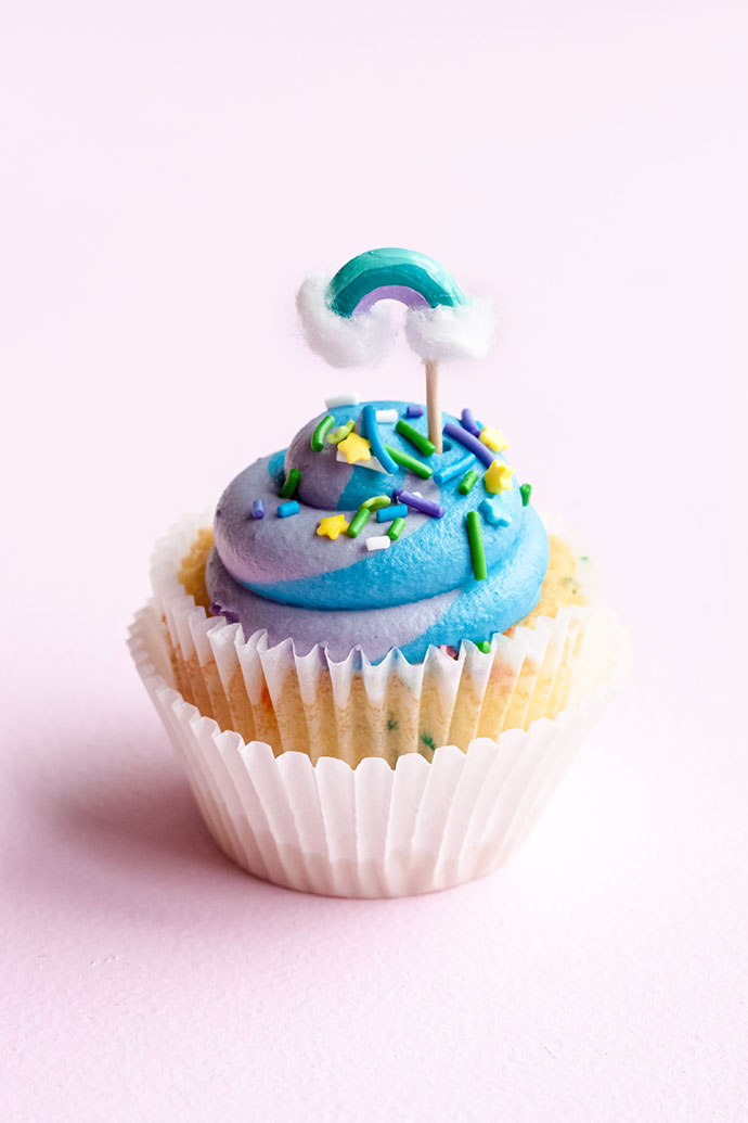 Isn’t it so magical when you see a rainbow in the sky? They will never get old, and neither will the rainbow trend! Pasta noodles offer so many crafting possibilities, and recently it hit me that large elbow macaroni noodles are shaped like perfect mini rainbows! It doesn’t take long to paint them, glue on tiny cotton clouds, and add a toothpick for the most adorable cupcake toppers.