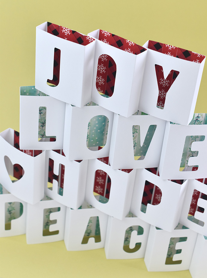 Spread messages of love, joy, hope, and peace when you decorate with these printable letters decorated with washi tape. Simple cuts and folding create dimensional blocks that stand on their own. And they’re even faster when you use a cutting machine and our SVG cut files!