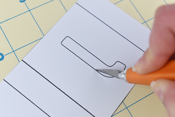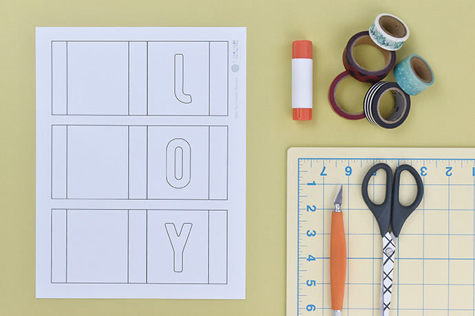 Print the PDF on cardstock and cut out the rectangles. Use a craft knife to cut out the letters.