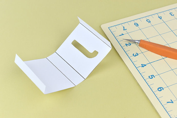 Fold the cardstock on the scored lines so that the letter reads correctly. On the printed version, the scoring lines should be on the inside of the folded shape.