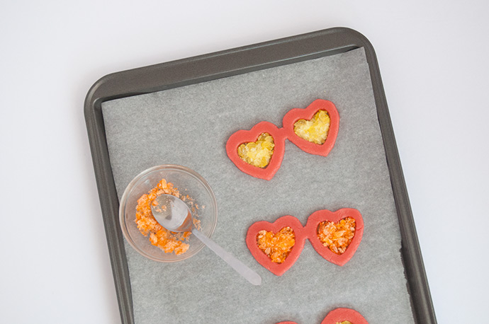 Carefully spoon the crushed candies into the lenses as shown. Bake the cookies (on parchment paper) following the directions in your recipe – the candies will start to bubble and melt after a couple of minutes in the oven. Once done, allow the cookies to cool and store in an air-tight container, separating each layer with a piece of wax or parchment paper to prevent the candies from becoming tacky and sticking to one another.