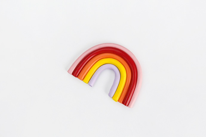 Roll the pink, red, orange, yellow, and light purple clay into long strips. Then, fold the colors on top of one another to form a rainbow.