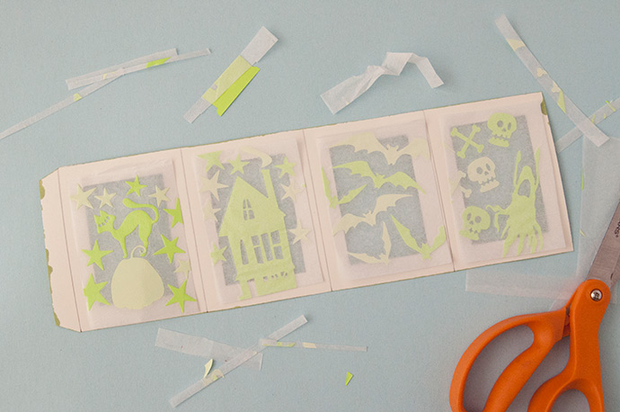 Once you’ve covered each window, lay the piece of white tissue paper on top, pressing it to adhere.
