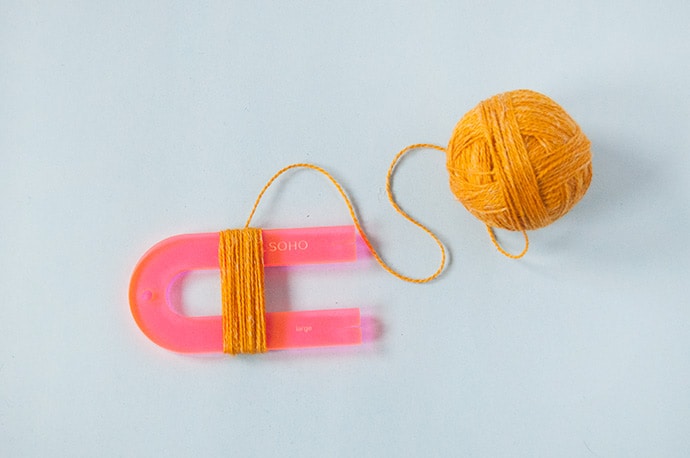 Start by winding your skein of Linen Quill and Line Weight yarn into balls. If you’ve never done this before, take a look at Purl Soho’s tutorial on how best to do this – it’s easy! Once you have a ball of yarn, wrap it around the large pink pom pom maker that comes in the set, about 20 rotations.