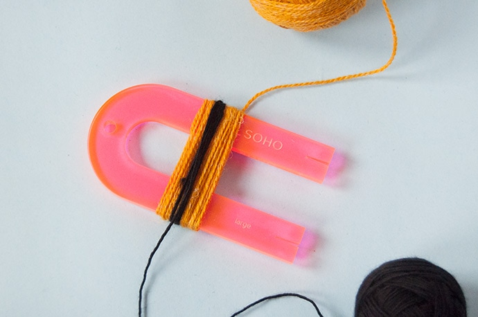 Keep the tumeric yellow yarn attached for now, but wrap about 5 rotations of the black yarn on top of it. Trim the black yarn so that it’s no longer attached.