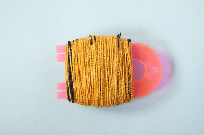 Continue wrapping with the tumeric yellow yarn, adding in rotations of the black yarn as you go. Because both these yarns aren’t very heavy, you will want to have about 600-700 rotations in total. Since you’ll be alternating between yarns, it can help to keep a tally on a scrap piece of paper to make sure you don’t lose count!