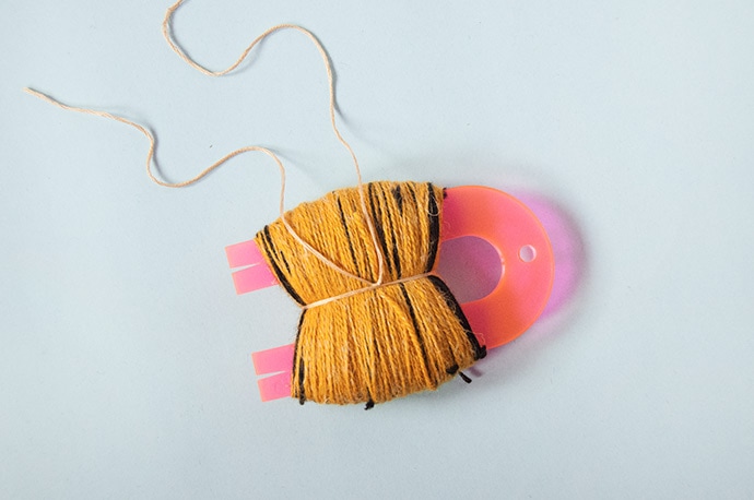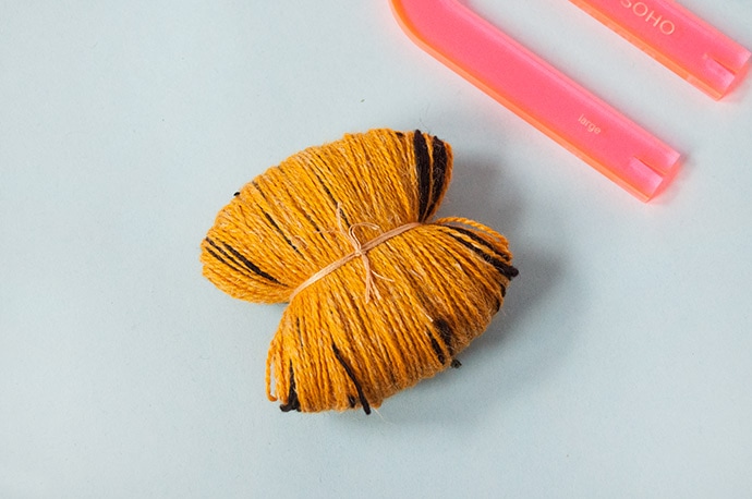 Once you’ve wrapped all your yarn, cut an 18″ piece of embroidery thread. Thread one end through the U-shaped gap between the wrapped yarn and the pom pom maker. Bring that same end up and over the wrapped yarn and then back through that same U-shaped gap again. Bring the two end of the embroidery floss together and make sure that the horizontal threads are nice and centered on the yarn wrap. Tie a surgeon’s knot but wrap the end through the loop twice. Pull the knot together but don’t pull tight yet.