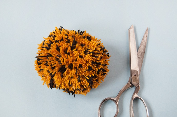 Use sharp scissors to cut all the yarn loops. You’ll now have a large shaggy looking pom pom like this. Isn’t the leopard pattern cool?