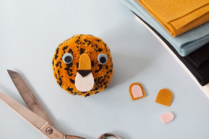 Arrange all the features onto the pom pom and glue in place. When gluing the ears, insert them slightly into the pom pom itself so that they stand up nicely and the base of each ear is hidden by the yarn. Let dry completely.