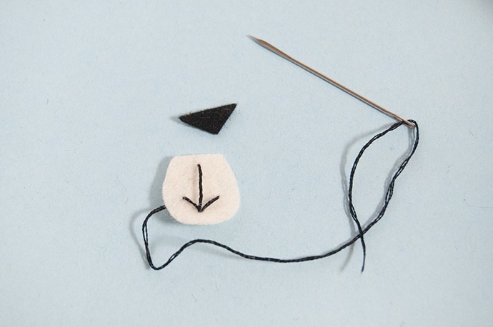 To make a little mouth for the leopard, separate 3 strands from the black embroidery floss and thread into a needle. Tie a double knot on the end and pull the needle up through the white felt mouth patch near the top. Bring the needle down through the felt closer to the bottom and pull the stitch taught. Next bring the needle up to the left and back down through the same spot as the bottom of the vertical stitch. Finally, bring the needle up to the right of the mouth patch, and down again through that same end of the vertical stitch. Tie a double knot on the back of the felt mouth patch to secure.