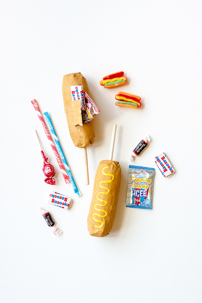Use a box cutter to cut three sides of a small rectangle into the back of your corn dog. The door will need to open enough to place small candies and prizes inside. Pull out the remaining balloon, and shake out any glue flakes. Fill the corn dog with some fun goodies, and close the door.