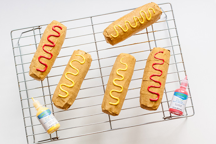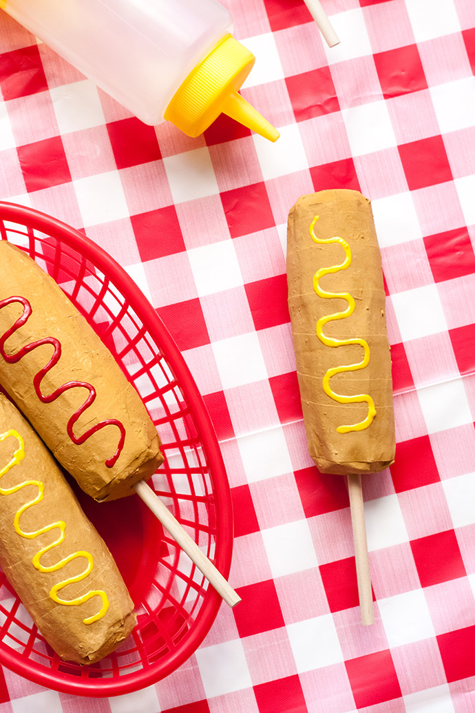 Once the paper mache is completely dry, paint the corn dog a nice shade of golden-brown using a sponge brush. You may want to mix several colors together on wax paper, and apply using a mesh sponge to add some character. Allow to dry, and then add a squiggly line using red or yellow puffy paint to look like ketchup or mustard. Allow to dry.