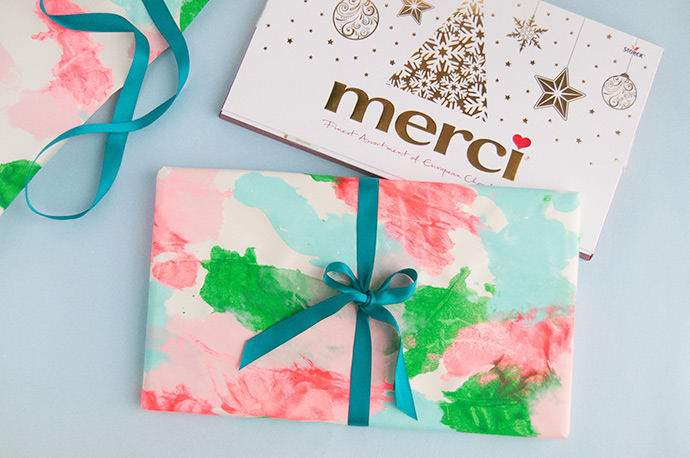 The D-I-Y gift wrap is the perfect way to get your kids involved and create a completely custom wrapping paper that’s a keepsake in itself! Kids of all ages can help with this, and we’re sharing three variations on the technique that works for all skill levels. And of course, we used all our handcrafted paper to wrap up boxes of delicious merci chocolates!