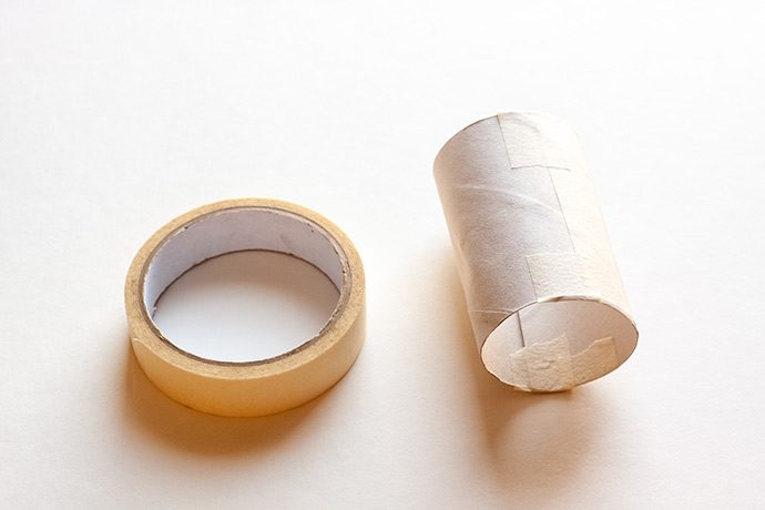 Use scissors to cut both of your toilet paper rolls open in a straight line. Tape them together to make the circle have about a 2-2 ½” diameter. Once you have attached them in one place, you may cut off the excess cardboard before closing the circle.