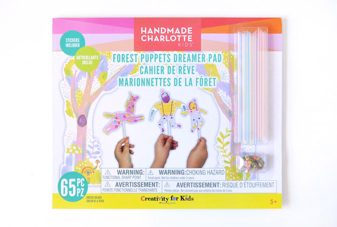 Dream on, dreamers! We can’t stop talking about our new line of kids’ craft kits and supplies available at Michaels nationwide – Handmade Charlotte Kids! Today we’re sharing a closer look at the Forest Puppets Dreamer Pad, one of the three dreamer pads in the line – see the other two here and here! Create your own puppet play using all the playful characters included in the activity book.