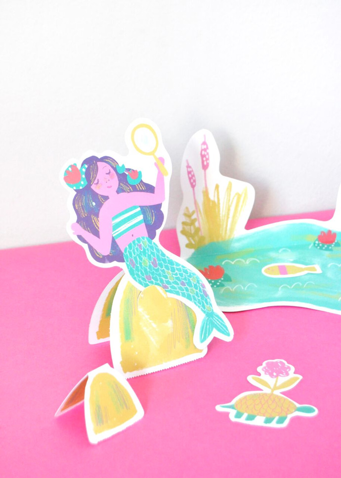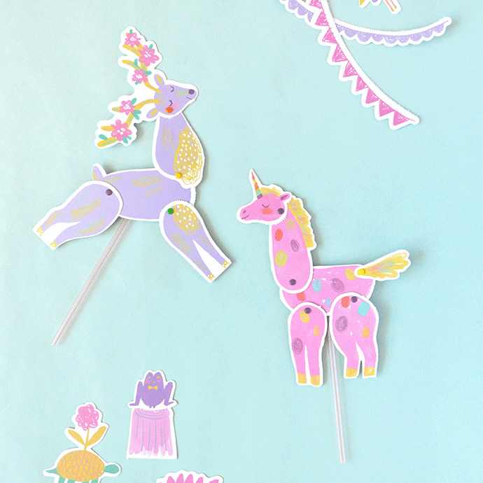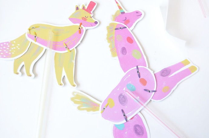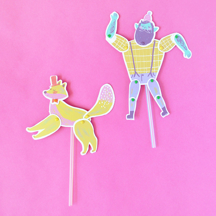 Apply a glue dot onto the back of the paper puppet and attach a straw. Voila! Continue popping out the paper props and backgrounds and perform a play for your friends!