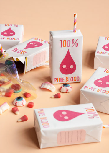 Make some faux “blood juice” boxes to fill with Halloween candy and favors for friends!