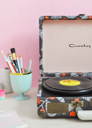Customize a plain record player with patterned fabric and Mod Podge!!