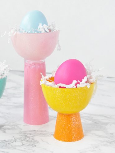 Turn clear plastic snack cups into bright and glittery egg cups for Easter!