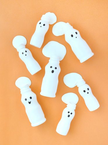 Empty plastic yogurt bottles are the perfect ghostly containers to hold slime this Halloween!