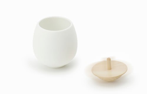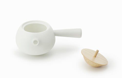 The teapot and cups have a thick wooden lid that fits snuggly to keep tea warm, with a pointed center that condenses the steam into liquid and directs it back into the teapot instead of dripping down the sides. When the top is removed, it can be spun, offering some tabletop amusement during tea time.