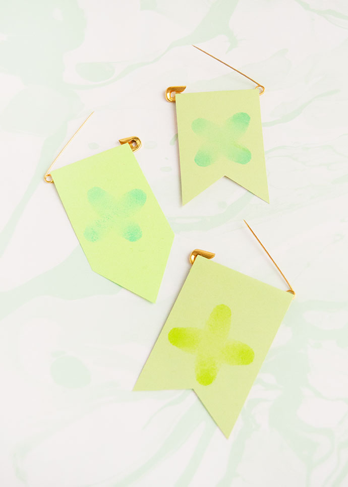 Apply a small line of hot glue along the top back of each clover. Press the safety pin into the glue and allow to dry. You can also use white glue or tape to secure the safety pins if you prefer.